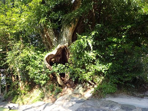 さて、八重垣神社には山神神社の他にも陰陽スポットがあります。縁結びのパワースポットとして知られている鏡の池に向かう途中、階段の横にある樹木の根本に近づいてみます。