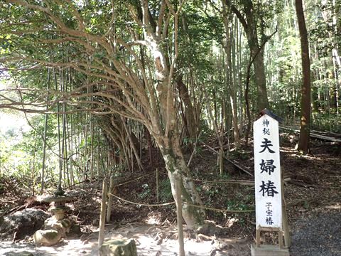 この後、せっかくなので八重垣神社で一番有名な「鏡の池」へ行ってみることにします。鏡の池がある奥の院へ向かう途中にあるのが夫婦椿(別名・子宝椿)。