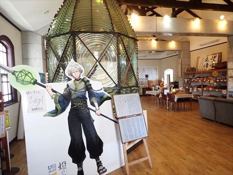レストランや土産物店が入っている建物もあり、灯台初代レンズの前に「燈の守り人」がいました。旅行後に調べたところ、灯台擬人化プロジェクトのキャラクターだそうです。