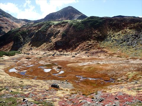 地図では「血の池」になっているエリア。大分県別府の血の池地獄とは違ってそこまで赤くはないものの、酸化鉄を含んでいるので水自体は赤くなっているそうです。