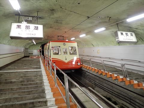黒部平から黒部湖まではケーブルカー。黒部湖に到着した車両はこんな感じで、急勾配を下りてきたことがわかります。
