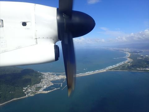小松空港からANAのプロペラ機で福岡へ。着陸前に眺められた海の中道と志賀島の風景。