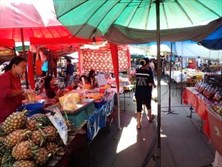 まだ時間があるので、露店エリアに戻ってみた。カットされたパイナップル(30バーツ)を買って、少し休憩。