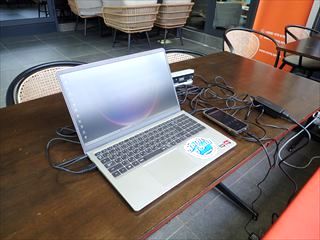 半屋外みたいなスペースは人が少なかったので、こちらで作業を行うことにした。室内は少し寒かったので、むしろこちらの方が快適。