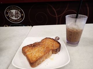 マレーシアやシンガポールでの代表的な朝食だというハイナントーストとホワイトコーヒーを注文してみた(13リンギ)。ハイナントーストには温泉卵が付くのが定番だそうだが、個人的に生卵や半熟は苦手なので卵なしを選択。