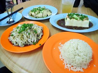 注文したのはイポー名物のもやし、チキン、豆腐の3品。白米と中国茶を合わせて値段は34.2リンギ。約1,200円でこのボリューム。
